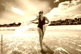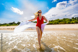 Summer vacations. Beautiful adult woman in red swimsuit and sunglasses holding white scarf fluttering in the wind walking in shallow water on sandy beach by sea on beautiful sunny day. Front view