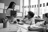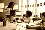 Young smiling teacher with tablet looking at clever schoolboy and answering his question at lesson of English grammar