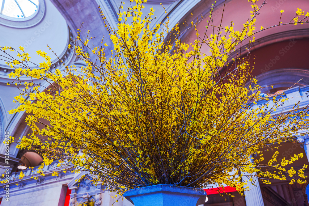 Vibrant yellow forsythia branches in large decorative vase inside historic building with arched ceilings. New York. USA.