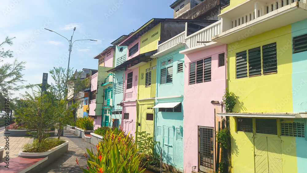Colorful Houses Along a Vibrant Urban Walkway on a Sunny Day