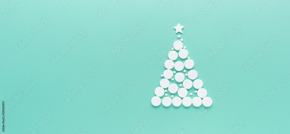 Christmas tree shape made of white pills with a star on top on a green background. Medical and holiday concept. Flat lay composition with copy space,