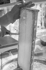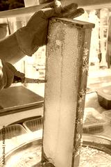 Beekeeper holds a frame in his hands and cuts honeycombs with honey. Bee products