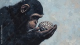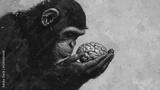 Illustrated monkey offering a brain artistic representation close-up view conceptual art thought provocation unique perspective