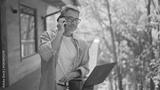 Mature freelancer working remotely on laptop and talking on phone on terrace of his wooden country house, enjoying fresh air and nature