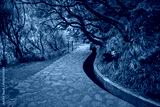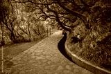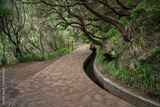 Curving hiking path next to Levada leading through forest with crooked trees, Madeira, Portugal
