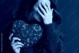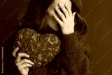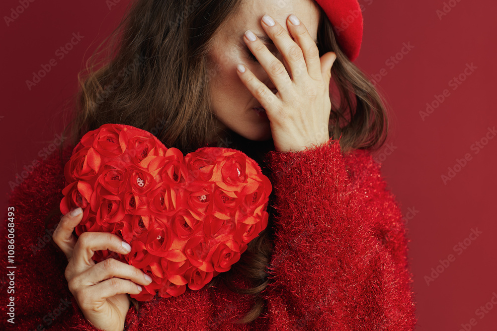 Closeup on female in red sweater and beret with red heart