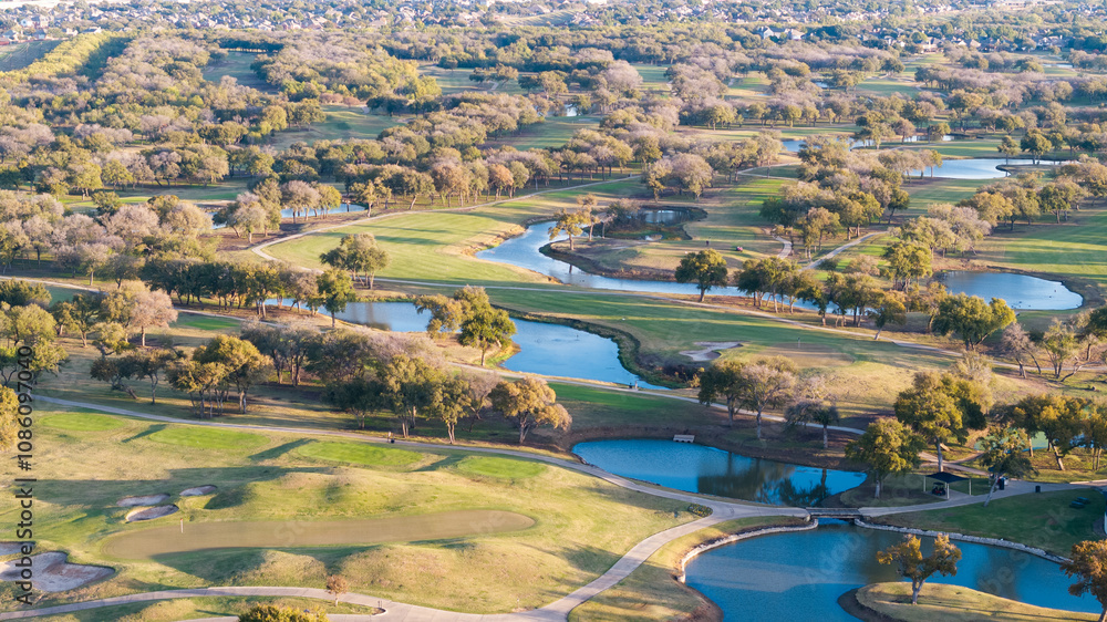 Aerial view of golf course landscape in Dallas-Ft. Worth (DFW) Metroplex during morning sunrise