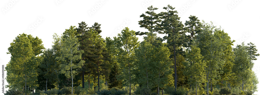 Frontal view Forest mixed trees (birch, sycamore platanus, spruce, pine, maple and other) isolated png on a transparent background premium cutout day lighting