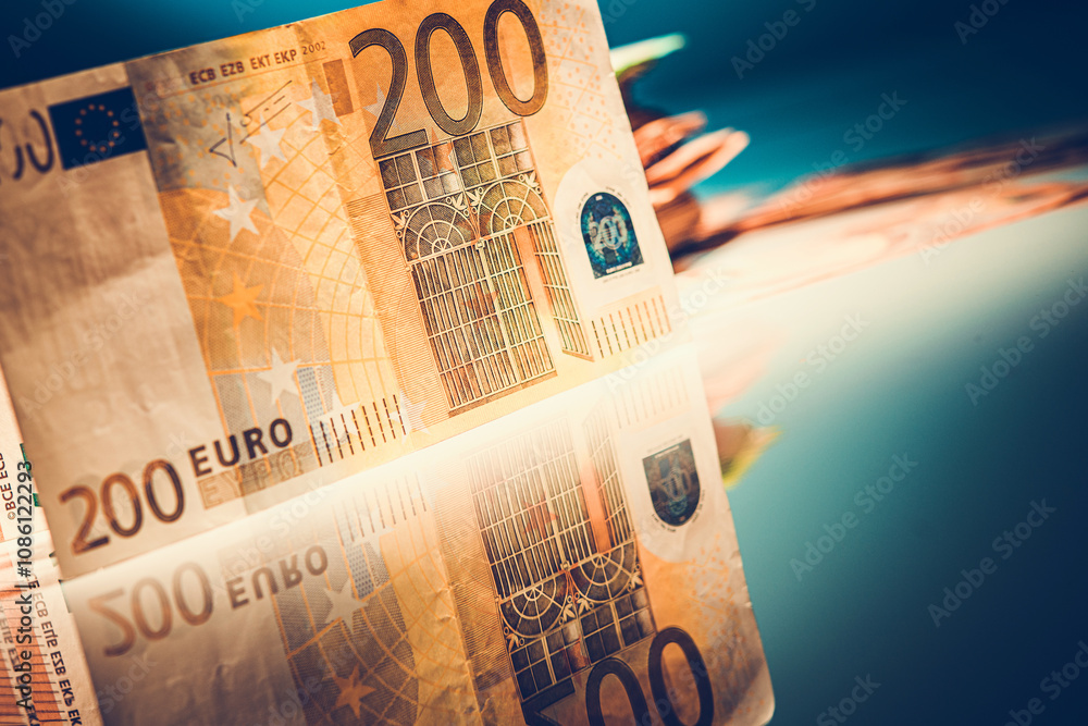 Close-up of a 200 Euro Bill Reflecting on a Smooth Surface in a Dimly Lit Setting