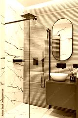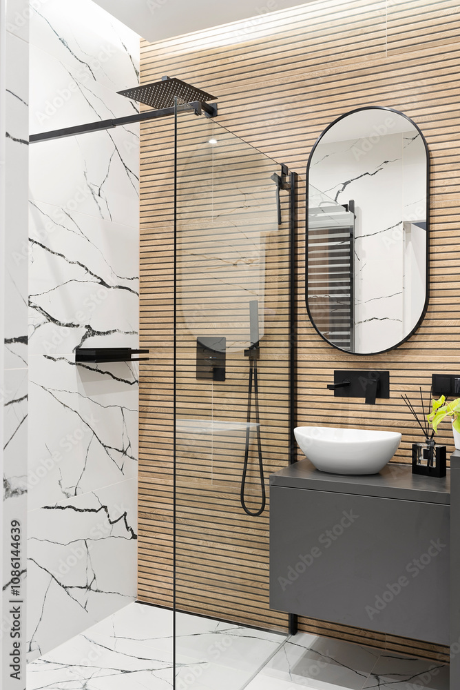 Modern interior of bathroom with ceramic wash basin with black faucet , wooden brown striped tiles on the wall and mirror. Luxurious hygiene room in industrial style with shower and glass. Vertical.