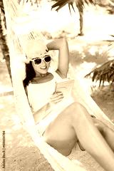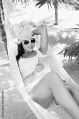 Relaxed woman on tropical vacation enjoying leisure on hammock reading on ebook.