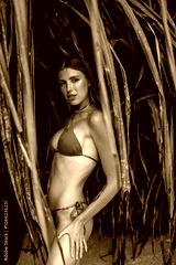 A Cheerful Smiling Woman Wearing an Orange Bikini Surrounded by Lush Greenery and Nature