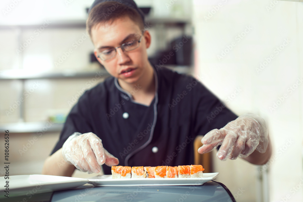 male cooks preparing sushi in the restaurant kitchen.