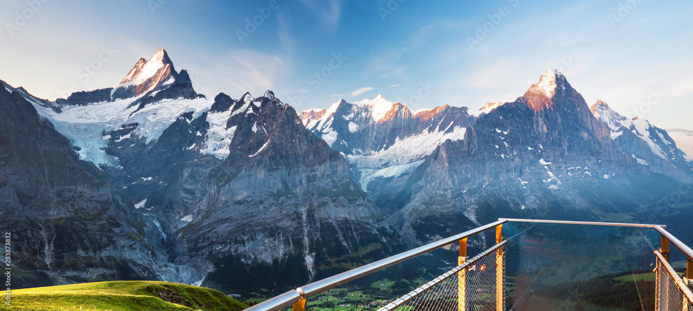 Mountain in the Switzerland in summer, panoramic view with mountain. Switzerland Alps nature and travel. Alpine scenery. Mountain with lake in Switzerland. Summer view over the lake and the alps in