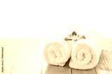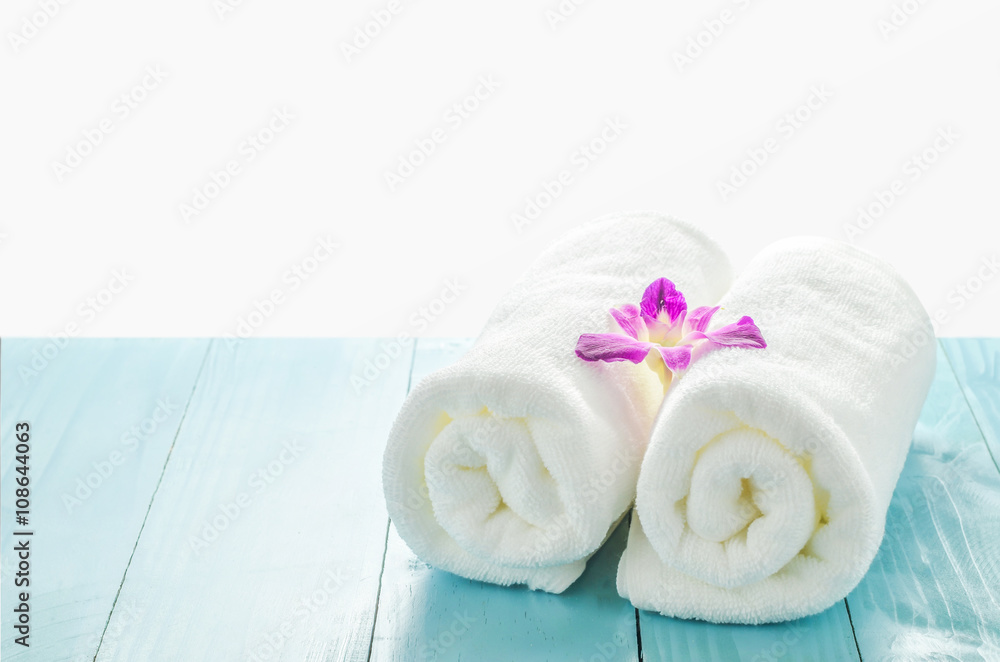 White towels roll with purple orchid flower
