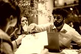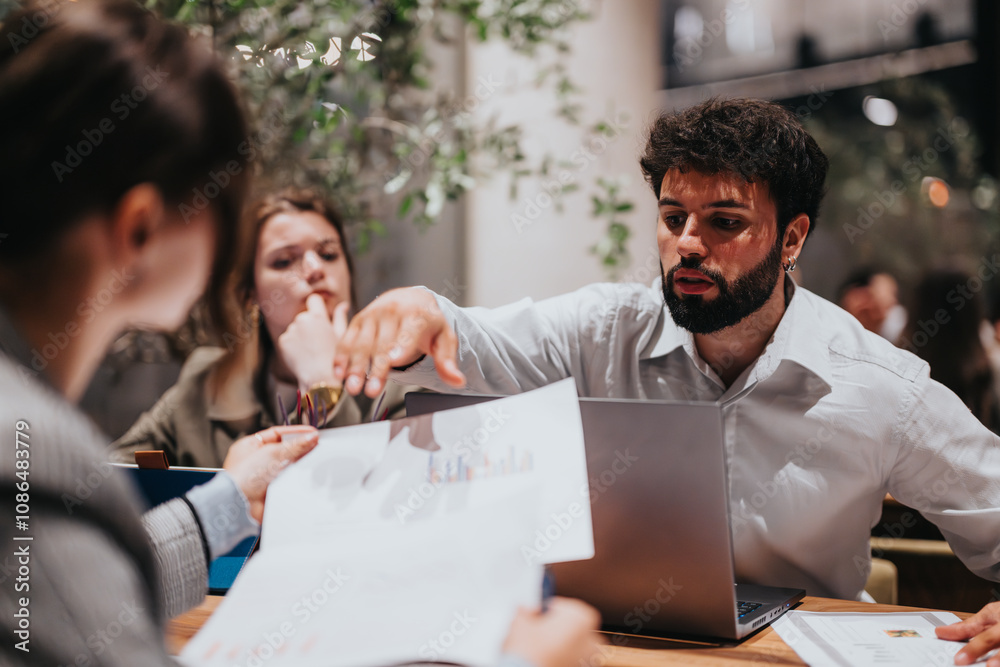 Team of businesspeople working together late at night in a coffee bar, focused on completing a project and catching a deadline.