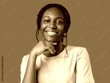 Young woman smiling joyfully in a pink shirt against a vibrant green background in a cheerful atmosphere