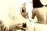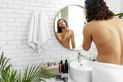 A man with curly hair grooming himself in the bathroom while looking into a round mirror