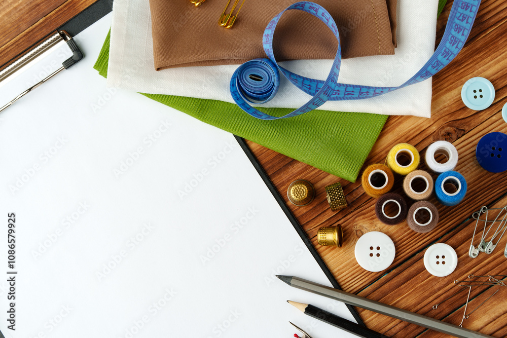 Colorful sewing supplies arranged around a blank clipboard on a wooden table