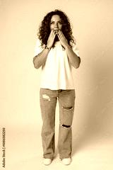 Surprised woman expressing strong emotions with wide eyes and raised hands, studio setting