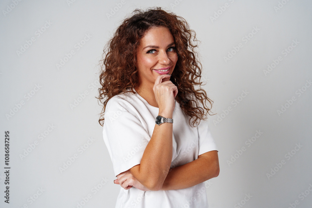 Woman with curly hair thoughtfully pondering in a neutral setting