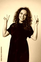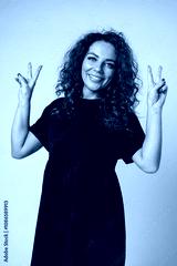 A young woman with curly hair poses cheerfully with peace signs in a neutral setting