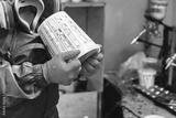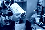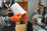 Worker in protective gear holds a paint container, preparing for spray painting in a workshop during the day