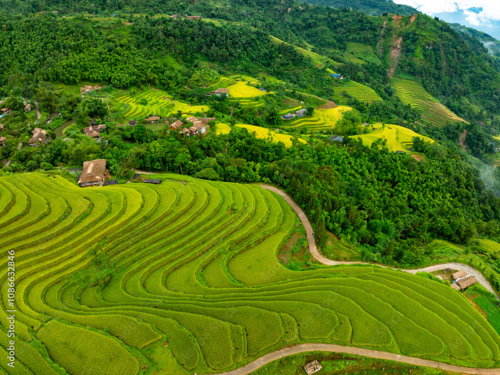 Drone aerial view of rice terrace field in harvest season,Green agricultural fields in countryside at northern Vietnam
