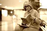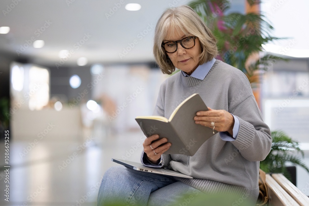 A woman enjoys reading a book in a modern indoor space surrounded by greenery while sitting on a bench in the afternoon
