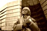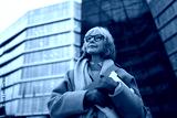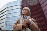 Older woman holding a laptop and standing confidently in front of modern glass buildings on a cloudy day