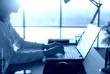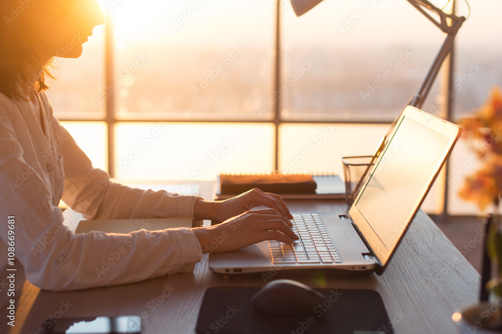 Female teleworker texting using laptop and internet, working online. Freelancer typing at home office, workplace.