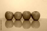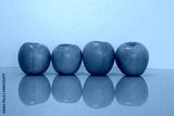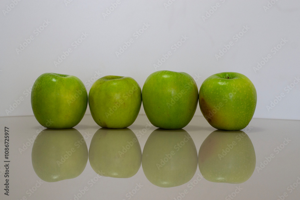 a group of green apples on a table with reflection