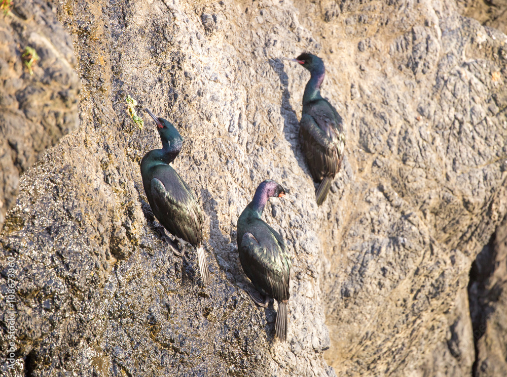 Pelagic Cormorants (Phalacrocorax pelagicus) hanging onto a cliff