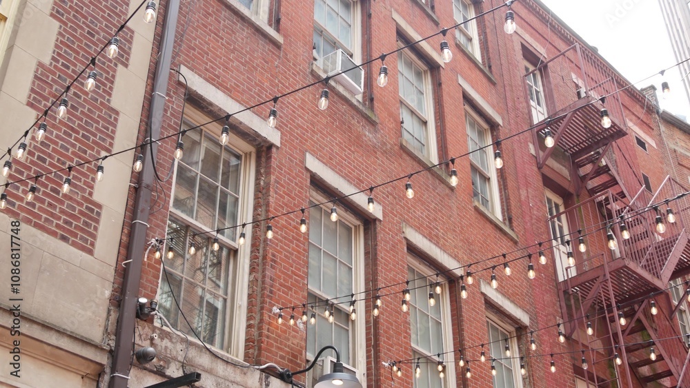 New York City classic building architecture. Residential house exterior. Real estate property in USA. Typical red brick facade. Manhattan downtown financial district, Stone street. Fire escape ladder.
