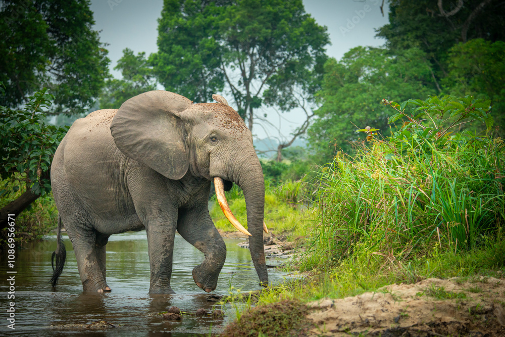 African forest elephant (Loxodonta cyclotis) and the Lekoli River. Odzala-Kokoua National Park. Cuvette-Ouest Region. Republic of the Congo