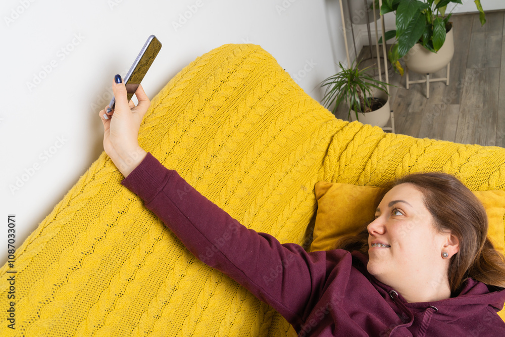 Woman wear braces using smartphone at home