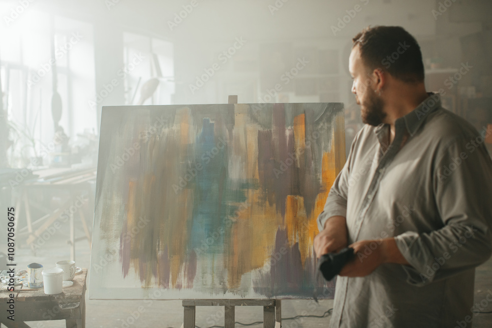 Male artist thoughtfully looking at a freshly completed painting in his studio.