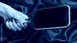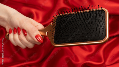 A red hairbrush in woman hand with red nails ion a red background.