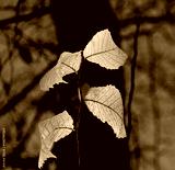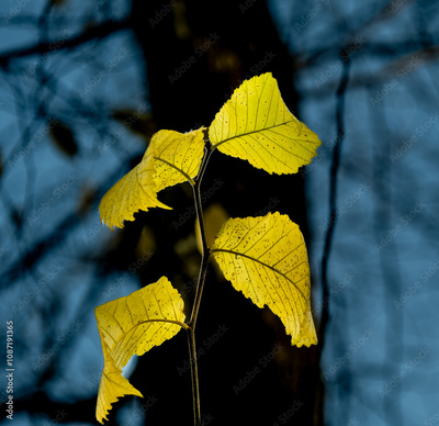 Yellow autumn leaves on a branch in the forest on a dark background.