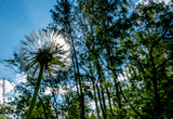 A dandelion in a field in close-up against the sky.
