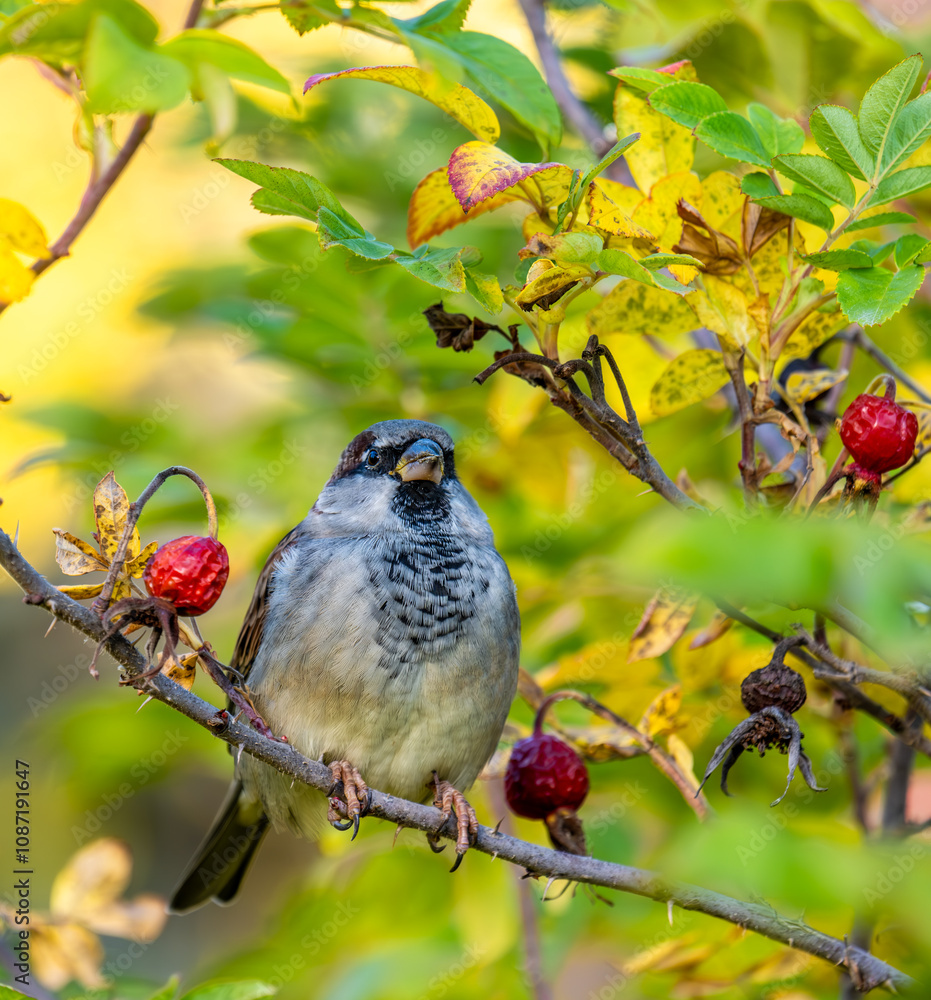A sparrow on a branch of a bush among wild rose bushes in close-up.