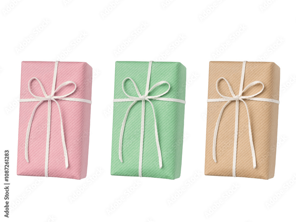 Three gift boxes in Christmas colors of pink, green, and beige with white string ribbon