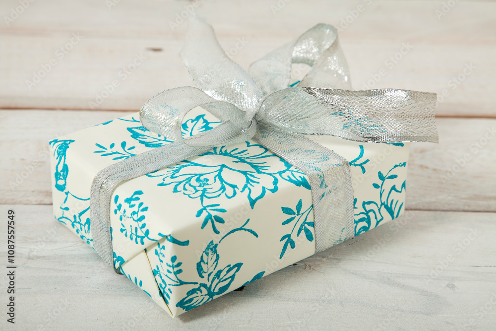 Geschenk in Geschenkpapier mit Silberschleife in Cyan Hellbau