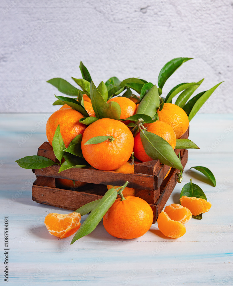 Fresh tangerines with leaves in a wooden crate on a blue table
