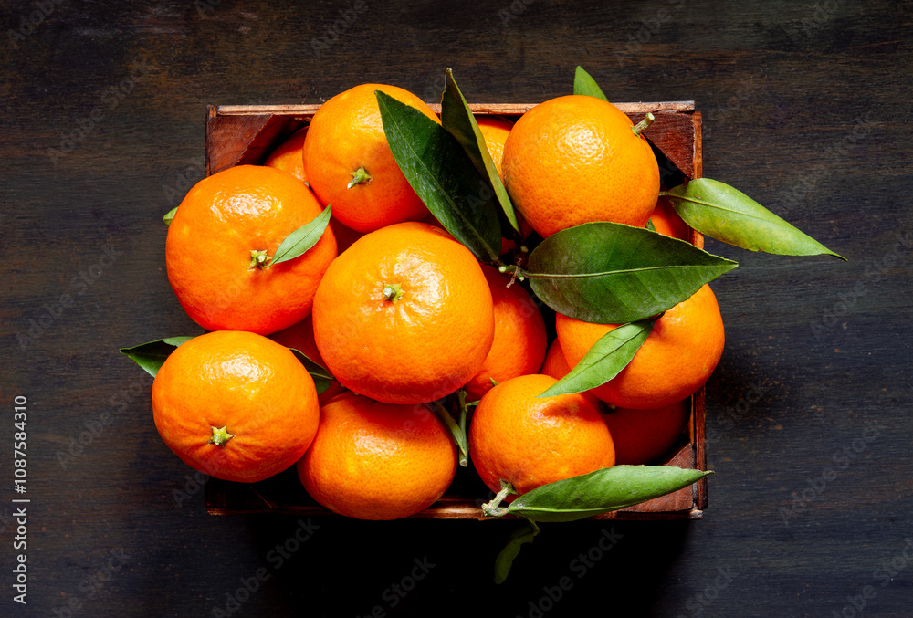 Fresh tangerines with leaves in a wooden crate on a blue table