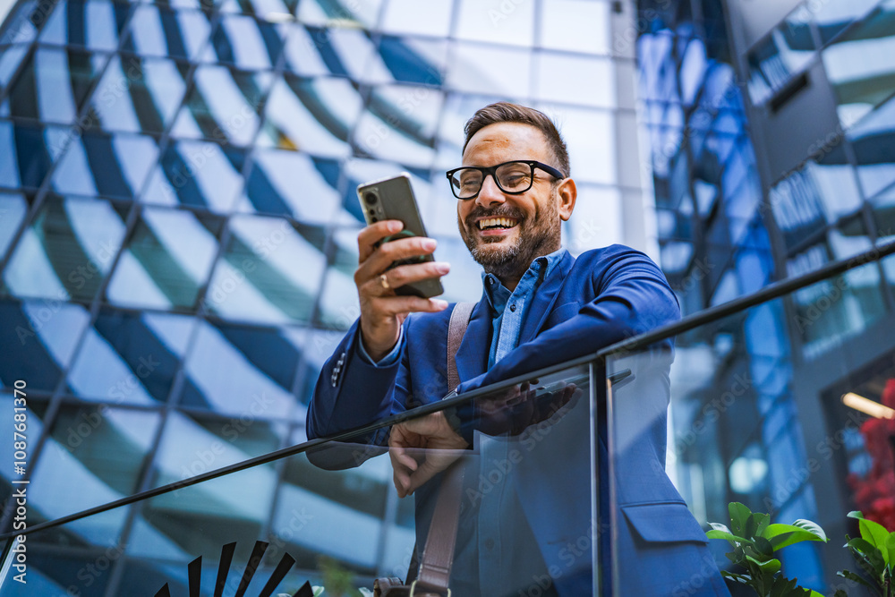 businessman use mobile phone, stand in front a modern glass building