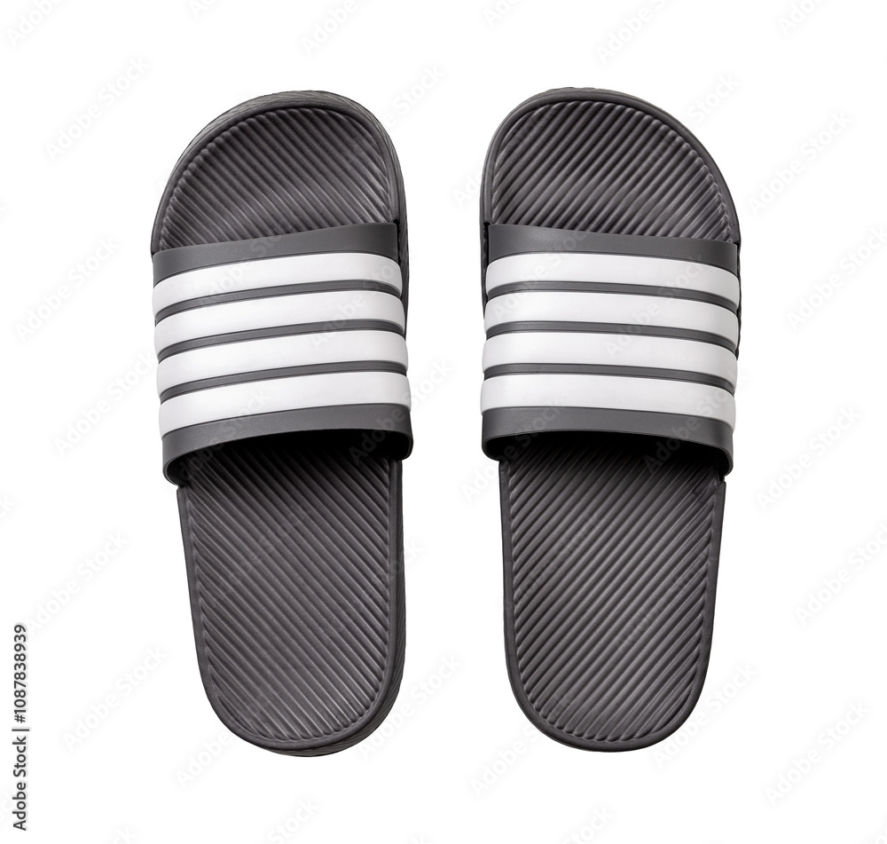Gray rubber slippers cutout. Pair of slide sandals isolated on white background. Comfortable beach flip flops for hot weather and summer vacation. Shoes for pool or shower.