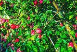 Abundant red apples growing on branches with vibrant green leaves in orchard.