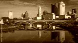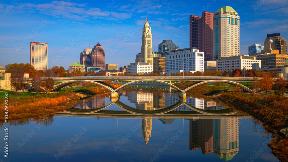 Columbus Ohio Skyline, Skyscrapers, and Landmark Buildings, USA: A vibrant tranquil beauty over the serene Scioto River water and green space in autumn