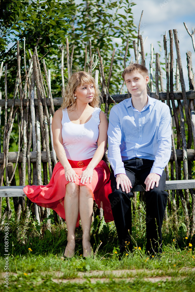 loving couple in the rural landscape. woman in a red dress and a man in a blue shirt